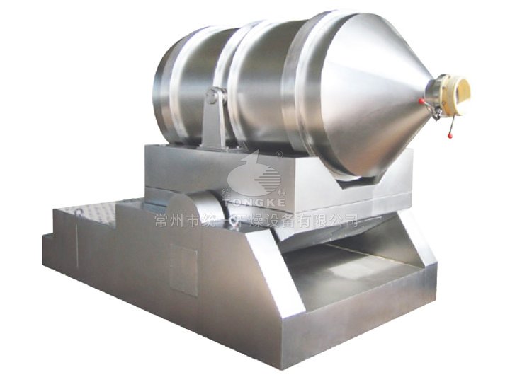 EYH二維混料機的轉筒可同時進行二個運動,一個為轉筒的轉動,另一個為轉筒隨擺動架的擺動。被混合物料在轉筒內隨轉筒轉動、翻轉、混合的同時,又隨轉筒的擺動而發生左右來回的摻混運動,在這兩個運動的共同作用下,物料在短時間內得到充分的混合。EYH二維混料機適合所有粉、粒狀物料的混合。