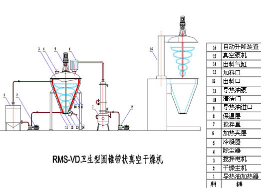 一、概述 為了達到GMP有關要求,我公司在圓錐帶狀真空干燥機的基礎上進行了改進,設計了衛生型圓錐帶狀真空干燥機,設備由加熱系統、加熱錐體、傳動系統、螺旋帶狀攪拌系統、真空系統、密封系統、冷凝系統、出料系統、上蓋自動升降系統及控制系統等部分組成。