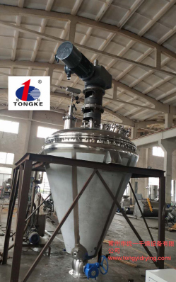 二、設備特點 1、上蓋采用了自動升降系統,清洗時可將上蓋(包括攪拌系統)升起,從而能徹底清洗設備內部,上蓋設計成圓弧結構,符合GMP要求; 2、傳動軸部位采用機械密封方式,并采用獨特的密封出料口,從而使錐體內能形成較高的真空條件,提高了干燥效率; 3、傳熱方式主要為傳導傳熱,且在攪拌裝置的作用下,傳熱表面不斷更新,熱效率得到了提高,節省能源; 4、與雙錐回轉真空干燥機相比,該設備的主體不需旋轉,加熱介質進出口和真空抽氣口不需要旋轉接頭,更有效地保證了真空度和工作的穩定性; 5、該設備集結晶、混合、干燥為一體,減少了工作環節,降低了設備和廠房的投資; 6、可實現真空進料,操作方便; 7、出料口位于錐體的^底部,出料時能完全排空設備內的物料,清洗也非常方便。